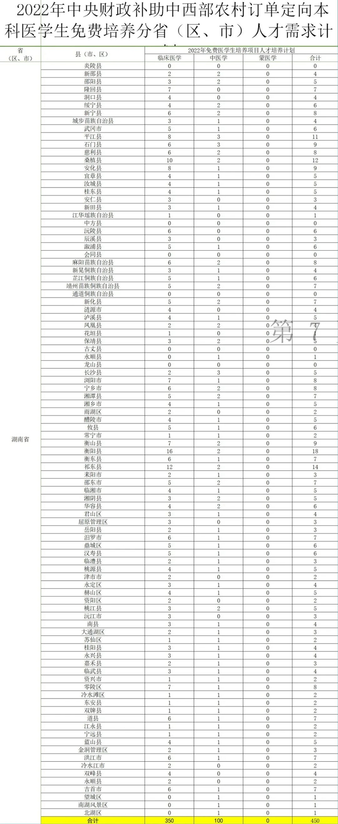 2022年中央财政补助中西部农村订单定向本科医学生免费培养分省(区、市)人才需求计划