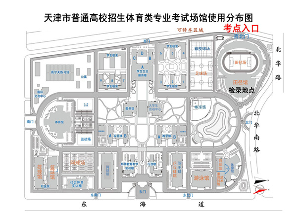 天津体育学院新校区(静海区团泊新城西区东海道16号)。考试当天,考生须从学校西北门进入考点。