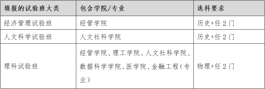 (二)人文科学试验班:首选科目为历史,再选科目不限。大一结束时学生可在人文社科学院的所有专业内选定主修专业;